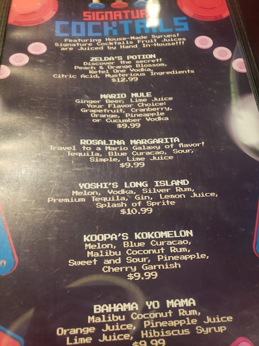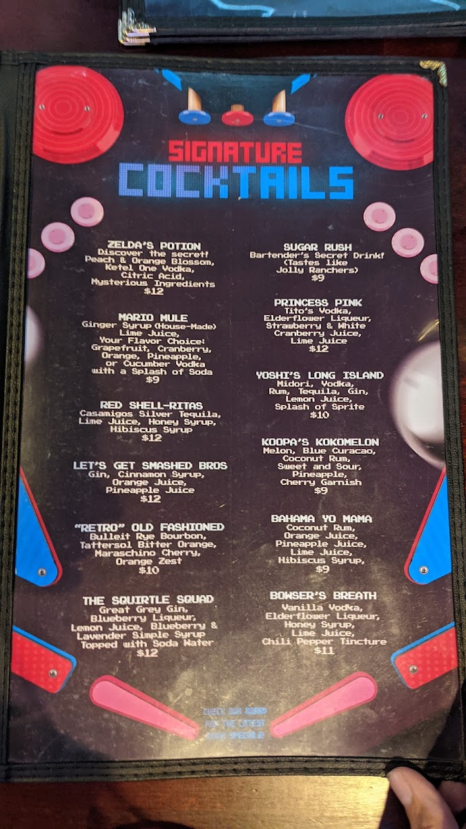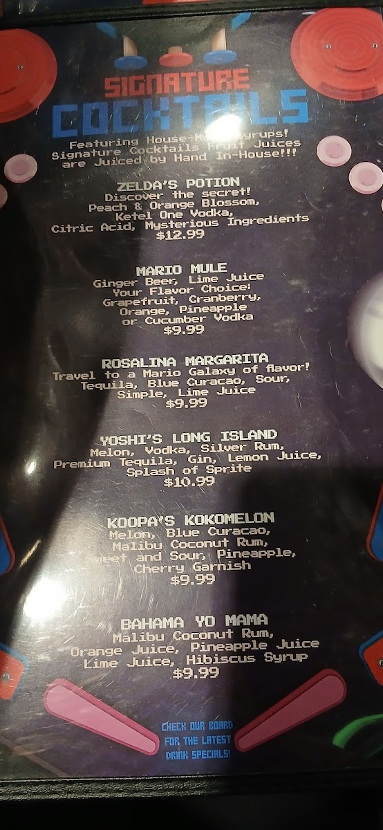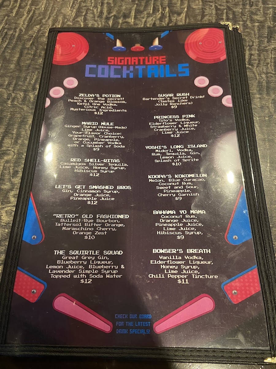 The drink menu features classic cocktails and inventive signature drinks with playful names, adding a touch of creativity to the experience. Whether sipping a Mojito or a themed cocktail like Zelda’s Potion, the beverages enhance the convivial vibe, ideal for unwinding after a few games or while catching up with company.
